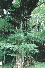 赤い小さな木の鳥居の後ろにイチョウがある。折りからの雨模様の中、濡れた幹はコケや寄生植物に覆われてじめじめしている。太い枝からは乳垂れが下がっている。雌木で県下でも注目すべき巨木である。かっては村人はこのイチョウの色付くのを見て、秋の田畑の仕事をしてきたといわれる。