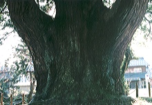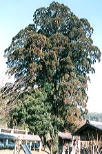 『伊野一本杉』は老人センターの前にあり、根元近くで三本に別れ高く聳え立っていた。幹の途中に桜やモチ、ネズ等の宿木がある。写真で一本杉下部の明るい緑の部分は宿木のモチノキと思われる。すぐ前にくっ付くように物置小屋ほどの社が立っていて、御神木でやむを得ないとはいえ、わずらわしい。もう少し離して建てれないものであろうか。