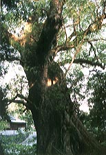 千本楠を探して境内に入ったところ、境内隅にこの木があった。その後、千本楠を見つけ見学の後、千本楠のどの楠よりもこの楠の方が太い気がして戻って写真に撮った。千本楠とは元は同じ森にあったと思われるが、今は間に道路や人家があって別の森になっている。