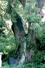 二又に分かれた太い幹のそれぞれに一級の巨木の貫禄があり、さすがに国指定のクスだと思う。しかし根元中心に腐朽が進んだためであろうか、モルタル等でしっかりと補修されワイヤーで倒壊を防ぐなど、手厚く手当されたのは良いが、一見異様な印象を受けたのが残念である。補修部分の彩色が茄子の紫というのが頂けない。