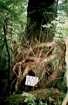 多雨多湿では土中で根が呼吸出来ないため、屋久杉の根が地上に出てきている。これを気根という。現物の前に説明板があった。
