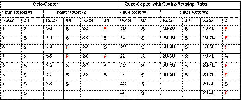 このケースではロータの合計枚数はいずれも8枚になります. 下の表はホバリング中にいずれか1枚または2枚のロータが故障した場合に