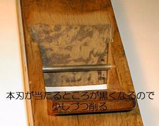 まず,刃の表を鉛筆でこすります。そして刃を鉋台に挿入します。そして鉋台の刃の当たる部分が黒くなったところが高いところです。3分か4分の鑿で少しずつ丁寧に削り落として下さい。少し削っては刃を入れて確かめ,又削るという行程を繰り返し,刃が均等に当たるように仕上げてて下さい。決してあわてて削りすぎないようにして下さい。最終的に数回叩いて刃先がちょっと出るくらいならOKです。