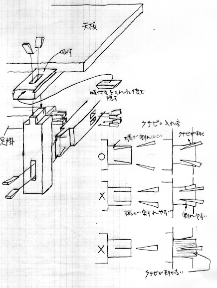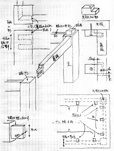 この図面の方法はもう一つの方法より簡単です。注意する点はほぞをあまりゆるく作らないことです。ただしきつすぎると足の上部のほぞ穴のほうが壊れてしまいますので気を付けて下さい。特にほぞは縦方向にきつく作ります。 組立時のボンドの塗布の仕方ですが,ほぞはほぞの先の方に,ほぞ穴は穴の入り口の方に塗布して下さい。差し込んだ時に胴付きの部分にボンドがほんの少しはみ出すぐらいが適当でしょう。また,ボンドが多すぎるとほぞ穴の奧にたまってほぞが入っていかないことがありますから気を付けましょう。しかし,ほぞ組の強度は接着剤に寄るところが大です。ボンドの用い方は少なからず多からずです。 駒止めはビスで天板に固定した時あまりがっちりと固定されては天板が動こうとするときに動けなくなりますから天板がガタガタしない程度のきつさになるよう作って下さい。図のa,b,cの隙間は天板が動いたときのことを考えて余裕を付けて下さい。 脚上部のほぞはあまり大きなほぞでなくてOKです。 |
