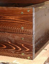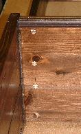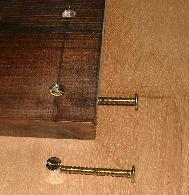 | 7 | 全体の様子を見ながら全部のネジを締め付けて下さい。 締め付ける際の注意 側板にはガイド板が貼り付けてありますので、それに密着するように取り付けて下さい。 材質が柔らかいのできつく締め過ぎるとボルトの頭が板に沈み込みます。 沈み込まないよう適度な力でしめて下さい。 縦横の直角が出ていることを確かめながら締め付けて下さい。 台輪を木ねじで下から止めて下さい。6本(締め過ぎないようにして下さい。) |