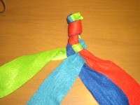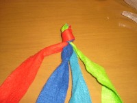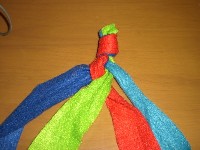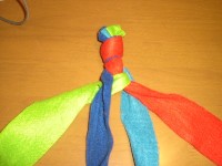 6 2〜5のパターンを繰り返すだけで平4つ編みの できあがりです。 最後は1と同じように結ぶだけです。 昔流行ったミサンガの要領です。 |