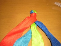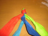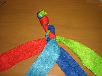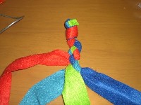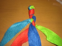 5 青を赤と緑の下を通し、水色と赤の間に出たら 赤の上を通し、赤と緑の間に置きます。 |