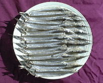 | 高級寿司店・デパートの価格を格安にてお届け! サヨリの「生」です。(写真上)」 ↑↑ 「生」は、「塩焼き・天ぷら・お吸い物」にして お召し上がり下さい。 当店でお刺し身(姿造り)にしての発送は別途、料金を頂きます。 (1匹につき300円の調理代。) ※)但し、釣り立て魚がある場合のみ承ります。 「酢の物」に調理しての発送も承ります。 料金は別途、頂きます。(2匹で500円の調理代。) ☆昆布〆にてお送りします。(寿司ネタとしても使えます!) |
